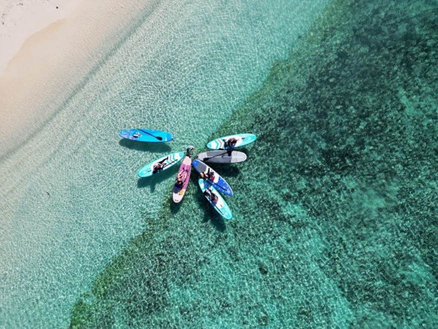 最新ドローンでの撮影中も、1人のガイドがお客様の近くにいますので、慣れない海でのSUP遊びも安心してご堪能いただけると思います。